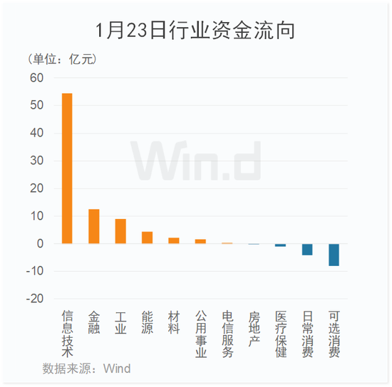 从1月23日行业资金流向来看,主力资金净流入70多亿元,多数行业净流入。其中,信息技术板块净流入额超50亿元,位居首位;金融、工业等板块净流出额亦较大。可选消费、日常消费等板块小幅净流出。