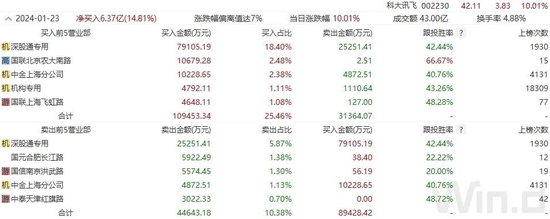 净买入方面,科大讯飞放量大涨,尾盘强势回封涨停,外资大买5.39亿元。