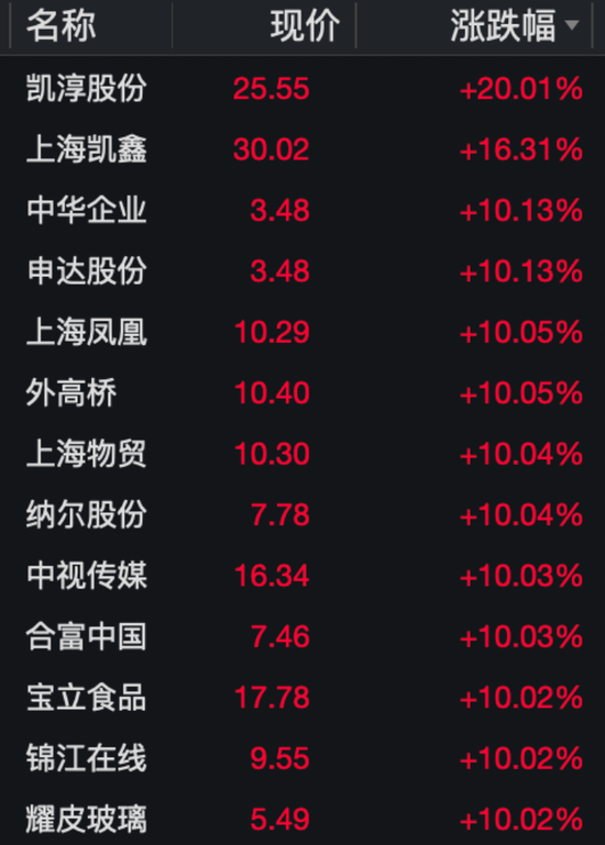 今日早盘,上海本地股再度爆发,凯淳股份“20cm”涨停,上海凯鑫、中华企业、申达股份、上海凤凰、外高桥等超20股涨停。