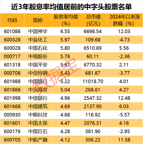 不少中字头股票连续多年分红,以2020年~2022年股息率均值来看,8股的近3年股息率均值超5%,中国神华的股息率最高,平均值达6.55%,公司在2020年~2022年连续3年慷慨分红,且股息率逐年升高。其中2021年、2022年现金分红总额超过500亿元,居于煤炭行业首位。历史数据显示,公司已连续16年进行分红,其中13年分红总额超百亿元。中国神华表示,公司2022年~2024年以现金方式分配的利润不少于当年实现归母净利润的60%。