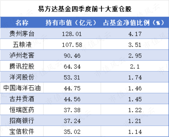 易方达基金前十大重仓股中有五只白酒股,分别为:贵州茅台、五粮液、泸州老窖、洋河股份(002304.SZ)、古井贡酒(000596.SZ),其余重仓股分别是腾讯控股、中国海洋石油(00883.HK)、恒瑞医药(600276.SH)、招商银行(600036.SH)、宝信软件(600845.SH)。
