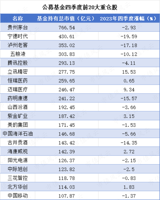 截至去年四季度末,纳入统计的5069只积极投资偏股型基金的前十大重仓股分别为:贵州茅台(600519.SH)、宁德时代(300750.SZ)、泸州老窖(000568.SZ)、五粮液(000858.SZ)、腾讯控股(00700.HK)、立讯精密(002475.SZ)、恒瑞医药(600276.SH)、迈瑞医疗(300760.SZ)、药明康德(维权)(603259.SH)、山西汾酒(600809.SH)。
