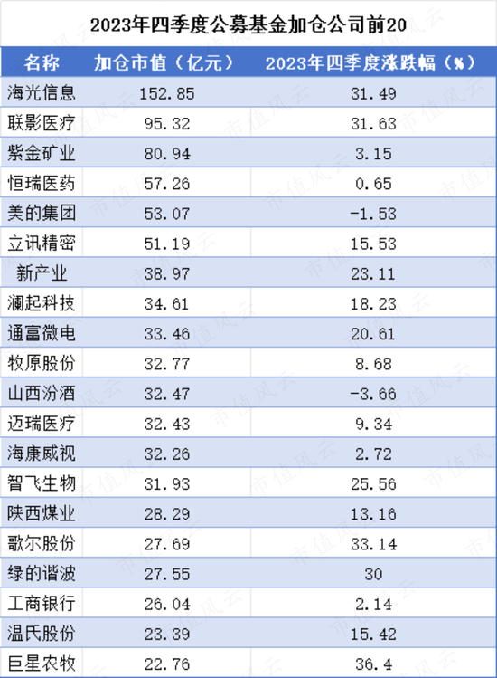 2023年四季度公募加仓市值排名前三的个股分别是海光信息(688041.SH)、联影医疗(688271.SH)、紫金矿业(601899.SH),分别增持2.15亿股、0.69亿股、0.65亿股,期末持仓市值合计分别为185.03亿元、105.33亿元、314.05亿元。