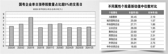 以最新收盘日的估值来看,地方国企个股市盈率中位数25.09倍,央企个股市盈率中位数27.71倍,低于民营企业、外资企业个股同期市盈率,同期A股整体市盈率中位数超30倍。
