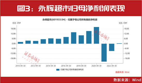 在业务呈现增长乏力的情况下,永辉超市归母净利润表现也处于“筑底阶段”,截至2023年三季报,公司归母净利润为0.52亿元,虽然远好于2022年和2021年同期的-8.87亿元和-21.78亿元,但仍低于公司除上述两年的历年三季报数据,为历史“第三低”(见图3)。