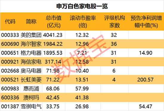 上述提及的冰箱、洗衣机、空调等品类均属于白色家电。证券时报·数据宝梳理,申万二级白色家电板块共计9只个股。从规模看,千亿市值股有3只,分别为美的集团、海尔智家以及格力电器。