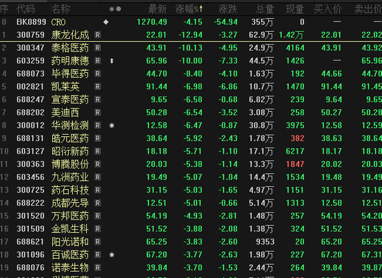 下跌股方面,CRO板块午后重挫,药明康德(维权)闪崩跌停,康龙化成、泰格医药股价大幅下跌,跌幅超过10%。