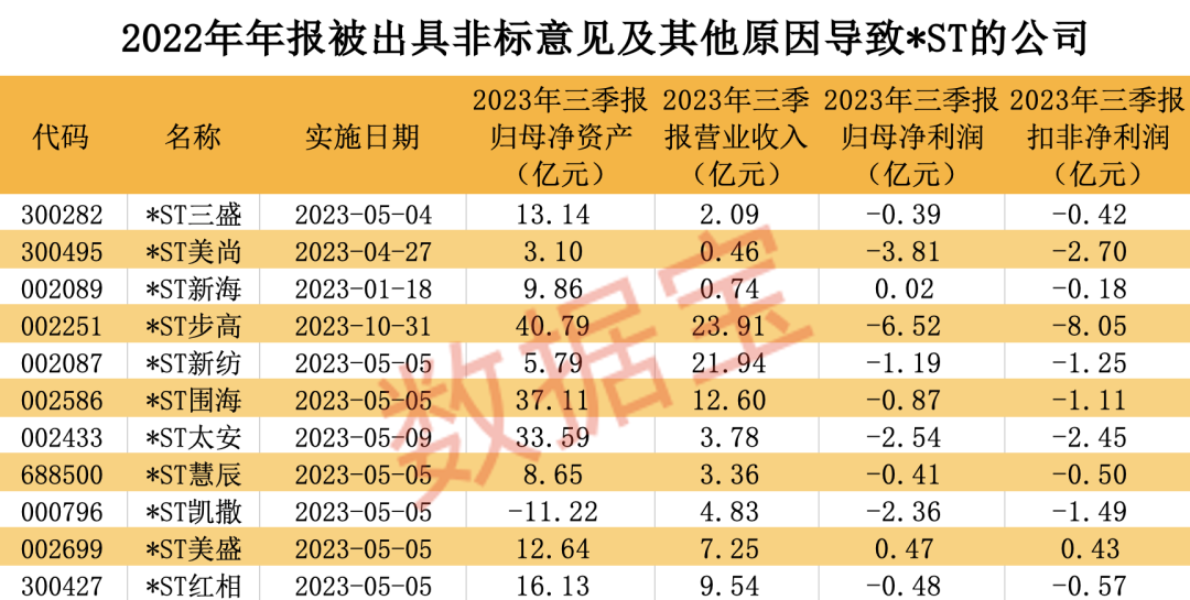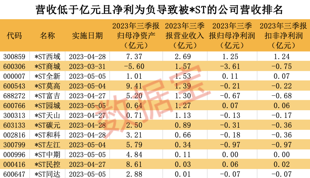 有13家公司因为2022年净利润为负值且营业收入低于1亿元(注:“净利润”以扣除非经常性损益前后孰低为准,“营业收入”为可持续的收入),导致在2023年被*ST。