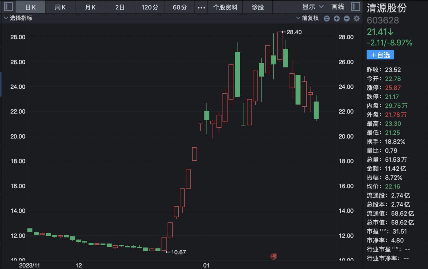 光伏支架可谓本轮光伏行情中表现最强的分支。具体来看,龙头清源股份自12月21日起开启暴涨并于1月18日收盘斩获20天12板,本周三盘中再度触及涨停。清源股份股价的强势表现自然带起了其他的光伏支架个股,在其于12月28日录得7连板时,主营业务包括光伏支架、输电线路铁塔等的汇金通和拥有光伏支架加工铝型材技术的闽发铝业当日涨停,并分别在随后几日斩获4连板和3连板。此外,宝塔实业自12月29日至1月3日亦录得3连板。