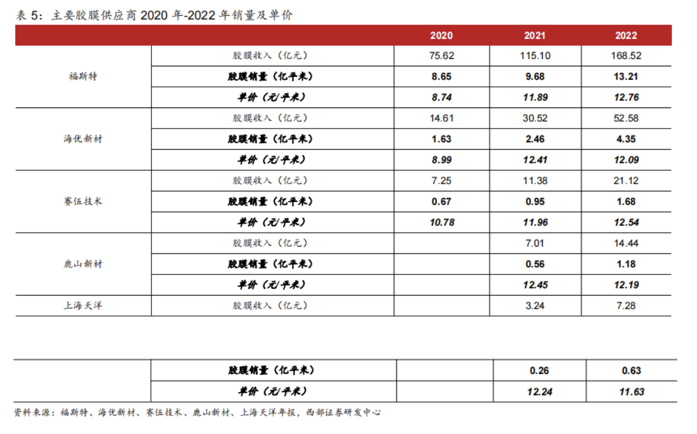 从供给端进一步来看,杨敬梅等人指出,龙头胶膜行业“一超多强”格局近年来逐渐明显,预计24年龙头效应更明显。福斯特仍稳居胶膜市场半壁江山,同时海优新材、赛伍技术等国内其他胶膜厂商不断扩产,胶膜产量大幅提升。