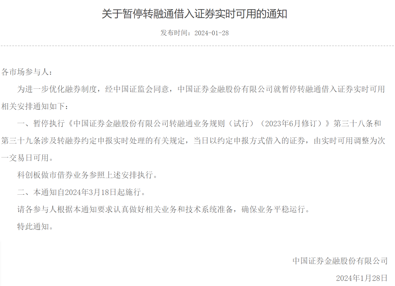 中证金融则发布通知,暂停执行《中国证券金融股份有限公司转融通业务规则(试行)(2023年6月修订)》第三十八条和第三十九条涉及转融券约定申报实时处理的有关规定,当日以约定申报方式借入的证券,由实时可用调整为次一交易日可用。科创板做市借券业务参照上述安排执行。并指出,本通知自2024年3月18日起施行。请各参与人根据本通知要求认真做好相关业务和技术系统准备,确保业务平稳运行。