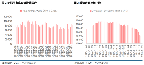 成交额持续回升,两融余额持续下降。本周沪深两市主板成交额有所回升,主要是受到沪深300ETF持续放量与政策利好后市场修复影响。本周北向资金净流入121.02亿,重新回到流入状态。两融余额持续下降,最低至16000.78亿元,内外流动性持续收紧。