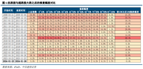 超跌股较抗跌股于大跌之后的修复行情中涨幅普遍更大。复盘2008年以来16段典型大跌之后的修复行情,计算修复行情起始日前20个交易日个股涨跌幅,将个股按照跌幅由大到小分为10组,并计算每组个股于修复期间的涨跌幅。在过往16段大跌之后的修复行情中,其中11段行情中超跌个股涨幅明显高于抗跌个股;3段行情中二者涨跌幅基本持平;2段行情中超跌个股涨跌幅稍弱于抗跌个股。并且,观察上证指数修复幅度与超跌、抗跌股涨幅差可以发现,市场修复级别越大,超跌股较抗跌股涨幅优势更加明显。观察本轮2024年1月23日以来至今的修复行情,尚未出现上述超跌股较抗跌股涨幅明显占优的情况,超跌股与抗跌股涨幅接近。从该角度判断,此轮行情或不能达到上述政策力度背景下预期的历史中上游修复幅度,期待进一步利好政策支持。