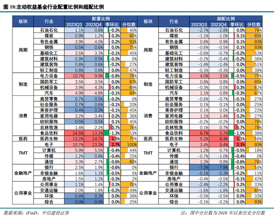 从主动权益基金持股市值占行业流通市值比例的角度来看,一二季度我们曾提示计算机和通信行业持股占比提升较快、到达相对高位。四季度最新情况来看,公募重仓持股占比较高的行业有家用电器、食品饮料、医药生物、电子,四季度提升较多的行业为农林牧渔。