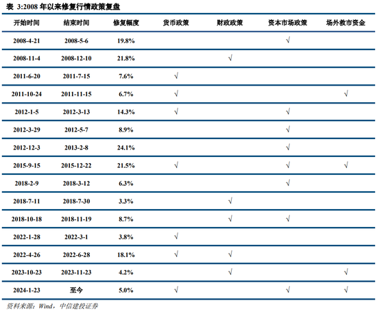本轮市场修复为多重政策驱动。1月24日,市场出现四重利好消息,其中两个为利好政策,两个为关键领导表态。其一,央行官宣将于2月5日下调存款准备金率0.5个百分点,向市场提供流动性1万亿元。此外,1月25日将下调支农支小再贷款、再贴现利率0.25个百分点。其二,中字头板块迎来大利好。国务院国资委有关负责人24日表示,将进一步研究把市值管理纳入中央企业负责人业绩考核。其三,证监会副主席王建军谈及近期股市波动、投资者保护等话题。国务院常务会议听取了资本市场运行情况及工作考虑的汇报,作出一系列部署,证监会正在抓紧落实推进。其四,央行行长潘功胜对未来货币政策积极表态。潘功胜于24日在国新办新闻发布会上表示,中国人民银行、国家外汇局将以专业务实的精神,贯彻落实好中央决策部署,坚持金融服务实体经济的根本宗旨,加大宏观调控力度,强化逆周期和跨周期调节,巩固和增强经济回升向好态势,持续推动经济高质量发展。1月27日,广州优化调整限购政策。政策提出,在限购区域范围内,购买建筑面积120平方米以上(不含120平方米)住房,不纳入限购范围。在限购区域范围内,居民家庭将自有住房用作租赁住房并办理房屋租赁登记备案手续的,或者在我市存量房交易系统取得房源信息编码并挂牌计划出售的,购买住房时相应核减家庭住房套数。一线城市调控迎来松绑,政策力度超出市场预期,有望改善房地产市场需求,促进市场复苏。复盘2008年以来由政策主导的修复行情,将其分为货币政策、财政政策、资本市场政策与场外救市资金4种类型,发现本轮修复行情已动用货币政策(降准)、资本市场政策(证监会表态与央企市值管理)、场外救市资金等多种政策手段,政策力度已处于历史中上水平。从政策力度角度来看,本轮修复行情幅度或处于历史中上游水平。