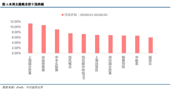 央国企改革概念火热。主题概念方面,本周受利好政策刺激,央国企改革相关概念火热,上海国企改革概念本周上涨11.28%。中共中央办公厅、国务院办公厅印发了《浦东新区综合改革试点实施方案(2023-2027年)》,主要内容为支持浦东新区高水平改革开放、打造社会主义现代化建设引领区。此外,国务院新闻办公室举行的发布会上,国务院国资委产权管理局负责人谢小兵介绍,国务院国资委将进一步研究将市值管理纳入中央企业负责人业绩考核。这一政策令市场对央企未来分红回购等一系列提升市值举措抱有预期,概念涨幅居前。