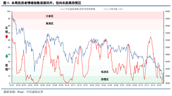 从当前情绪指数来看,周五市场情绪尚未脱离恐慌区,市场上涨的趋势仍需得到右侧确认。一些关键的情绪分项指标也表明当前市场仍然较为弱势,市场存在继续修复的需要。