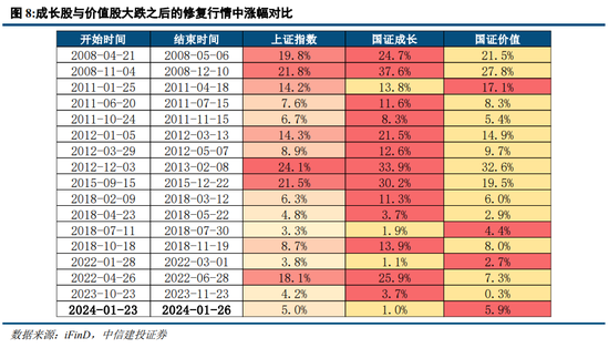 成长股较价值股于大跌之后的修复行情中涨幅普遍更大。复盘2008年以来17段典型的大跌之后的修复行情国证成长与国证价值涨跌幅,其中13段修复行情中,成长股涨幅明显高于价值股;4段行情中价值股表现优于成长股。大跌之后的修复行情中成长股多表现更优。截至目前为止,本轮修复行情受央国企改革概念火热影响,价值股涨幅更大,上涨5.9%,成长股仅上涨1.0%。