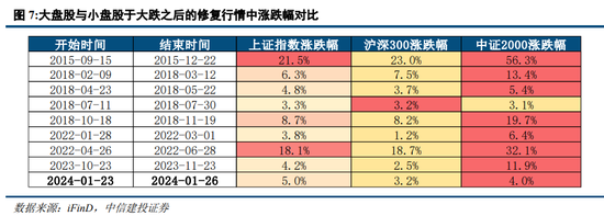 小盘股较大盘股于大跌之后的修复行情中涨幅普遍更大。复盘2015年以来至今的9段大跌之后的修复行情中沪深300与中证2000指数涨跌幅,其中8段修复行情中,代表小盘股的中证2000涨幅明显高于代表大盘股的沪深300涨幅;其中1段大跌之后的修复行情中,二者涨幅接近。小盘股在大跌之后的修复行情中表现普遍优于大盘股。2024年1月23日至今的修复行情中,中证2000涨跌幅为4%略高于沪深300涨跌幅。受本轮修复行情中很大程度由“央企市值管理”与“上海自贸区”相关政策驱动影响,央国企等大盘股涨幅居前,此轮修复行情中大小盘股表现相对比较接近,小盘股尚未表现出明显优势。