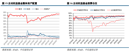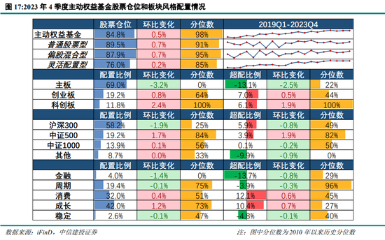 2023年4季度,政策发力效果仍不及预期,市场继续下探。主动权益基金股票仓位提升0.5pct至84.8%,处于98%历史分位。整体来看,主动权益基金股票仓位达到84.8%,环比提升0.5pct,处于2010年以来98%的历史分位水平。普通股票型、偏股混合型、灵活配置型基金股票仓位分别达到89.5%、87.9%、76.0%,分别环比回升0.7pct、0.7pct、0.2pct,分别处于2010年以来91%、95%、85%的历史分位水平。