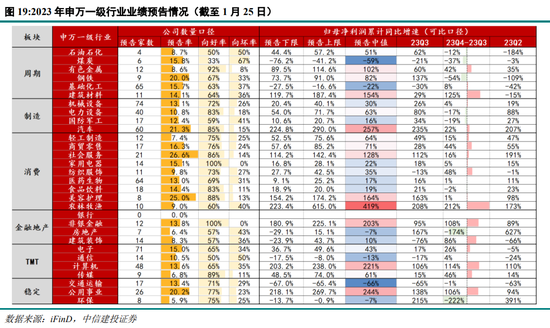 近期上市企业密集披露2023年年报业绩预告,截至1月25日,全A共有约700家公司披露23年年报业绩预告,其中向好率约72%,预告中值增速为12.1%,后续预告值预计会向下修正。结合23Q4宏观数据看,PMI连续三个月超季节性环比下行,验证经济需求复苏依旧偏弱,预计四季度全A盈利同比在低基数效应下有望实现正增,但较Q3的改善幅度有限(Q3全A、全A非金融石油石化归母净利单季同比增速分别为0.2%,1.8%)。在中字头及核心资产带领指数企稳后,预计超跌+业绩超预期且具备持续性改善动能的方向也能有不错表现。