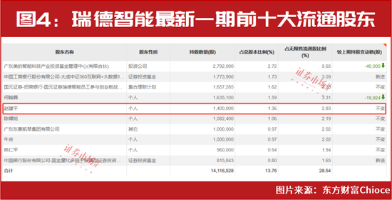 据上市公司公告显示,瑞德智能于近期同样披露了截至1月22日的最新一期前十大股东名单,相比2023年三季度末,公司前十大流通股东有2位减持,2位新进,6位持股未动,赵建平就位列持股未动的阵营,其继续持有公司140万股(见图4)。