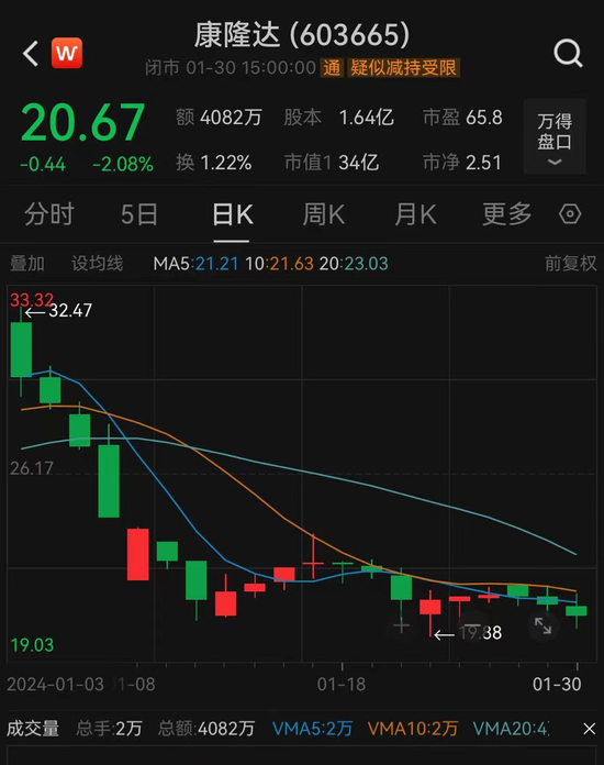 截至1月30日收盘,康隆达每股报20.67元,1月以来下跌32.14%,最新市值34亿元。