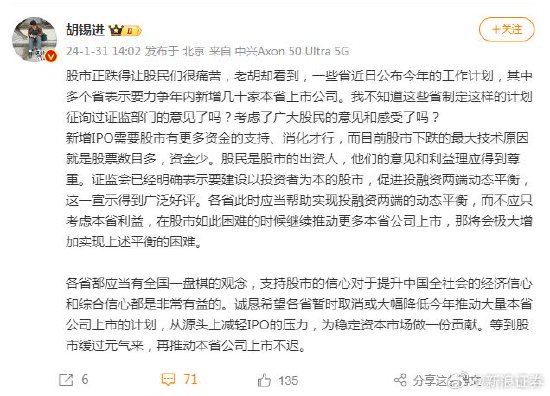 1月31日,胡锡进发微博称,股市正跌得让股民们很痛苦,老胡却看到,一些省近日公布今年的工作计划,其中多个省表示要力争年内新增几十家本省上市公司。我不知道这些省制定这样的计划征询过证监部门的意见了吗?考虑了广大股民的意见和感受了吗?