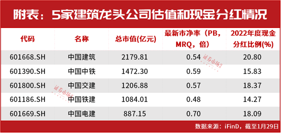 iFinD数据显示,A股建筑板块的前五大公司均为国企,分别是中国建筑、中国中铁、中国交建、中国铁建、中国电建,他们的PB都已经破净,且中国铁建的PB值最低,仅有0.48倍。值得一提的是,中国铁建是5家企业中现金分红率最低的,2022年度现金分红比例仅有14.3%,而其他四家公司的现金分红率基本处于15%~20%之间。