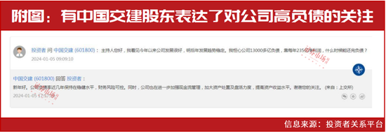 今年1月,有投资者在互动平台上向中国交建董秘提问,“担心公司13000多亿负债,靠每年235亿元净利润,什么时候能还完负债?”