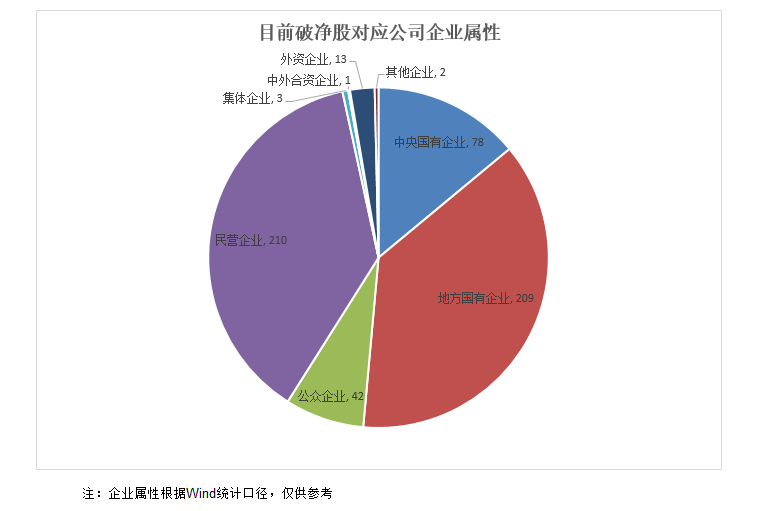 另据Wind统计口径,从企业属性来看,上述破净股公司群体中,中央国有企业、地方国有企业分别有78家和209家,合计287家,占到破净股公司总数的一半以上,带有国资色彩的上市企业是破净公司最多的群体。除了各类国有上市企业之外,民营上市企业中破净公司也较多,超过200家。公众企业、集体企业、中外合资企业、外资企业等其他企业属性的上市企业破净股公司数量相对较少。
