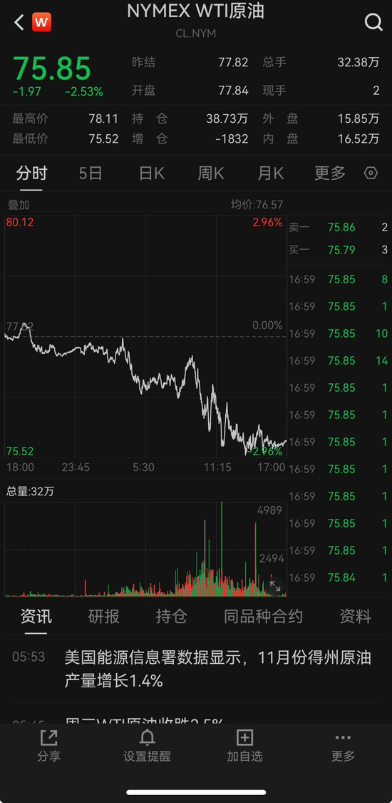 国际油价全线下跌,美油3月合约跌2.53%,报75.85美元/桶。布油4月合约跌2.39%,报80.53美元/桶。