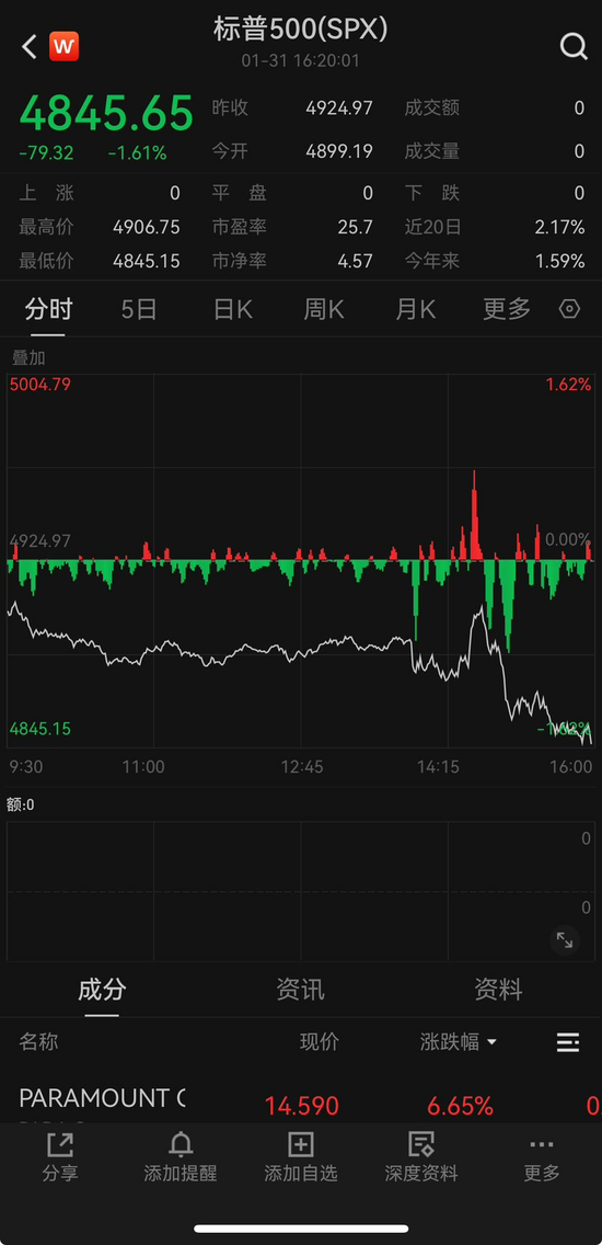 美国三大股指全线收跌,道指跌0.82%报38150.3点,标普500指数跌1.61%报4845.65点,纳指跌2.23%报15164.01点。思科跌3.94%,微软跌2.69%,领跌道指。万得美国TAMAMA科技指数跌3.08%,谷歌跌7.5%,特斯拉跌2.24%。中概股涨跌不一,能链智电涨9.1%,亿航智能跌5.8%。1月份,道指涨1.22%,标普500指数涨1.59%,纳指涨1.02%。