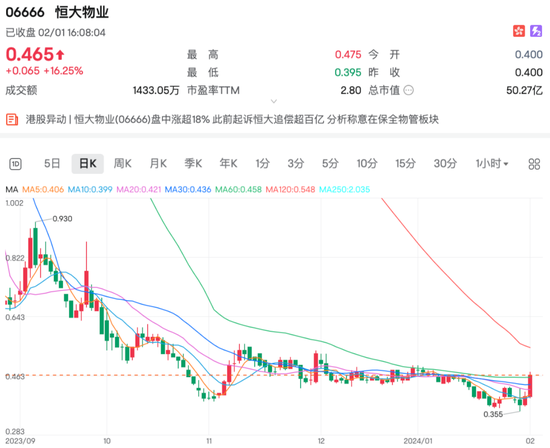 2月1日,恒大物业盘中大涨18%,收涨16.25%,报0.465港元,成交额为1433万港元。公司股价近2日反弹24%。
