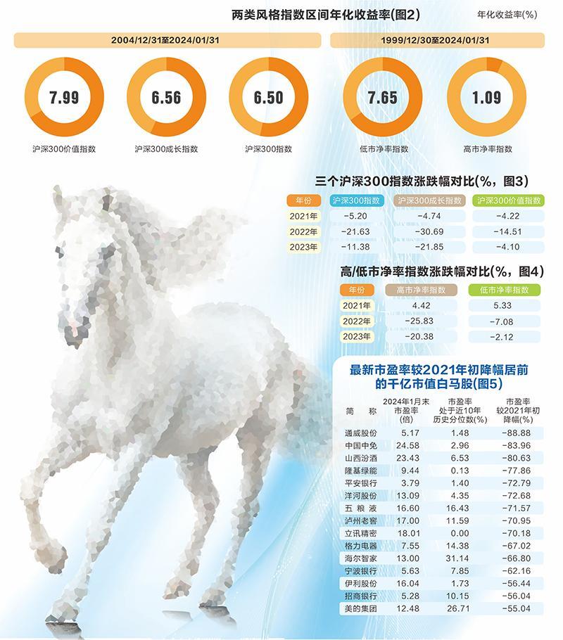 实际上,2021年~2023年,虽然不少白马股持续下跌,但沪深300价值指数连续三年均跑赢沪深300成长指数和沪深300指数;申万低市净率指数也连续三年均跑赢申万高市净率指数(图3、4)。
