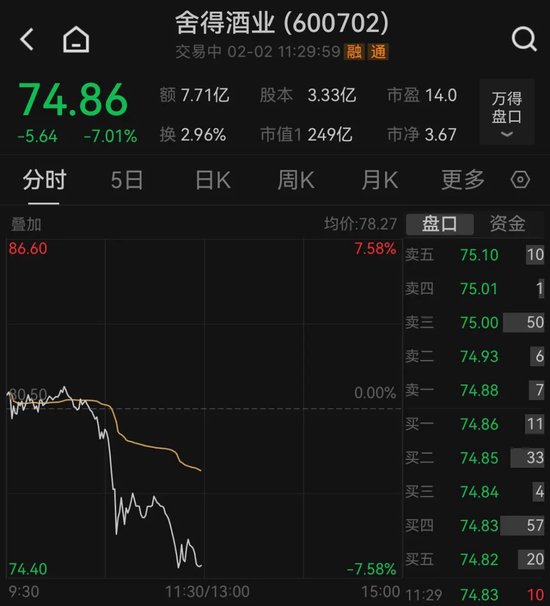 2月2日早盘,白酒股一度领涨,临近午盘突发闪崩,舍得酒业跳水跌超7%,酒鬼酒跌近6%,老白干酒、金种子酒跌超2%。