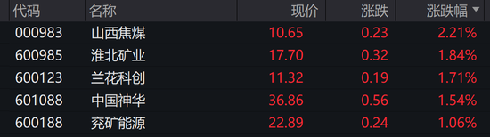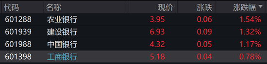 午前,中字头再度活跃,煤炭、银行双线进攻,四大行均涨约1%;煤炭方面,山西焦煤涨超2%,中国神华、淮北矿业跟涨。
