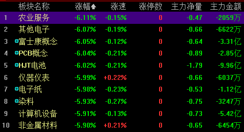 盘面上,农业服务、HJT电池、仪器仪表、染料、计算机设备等板块跌幅超5%。