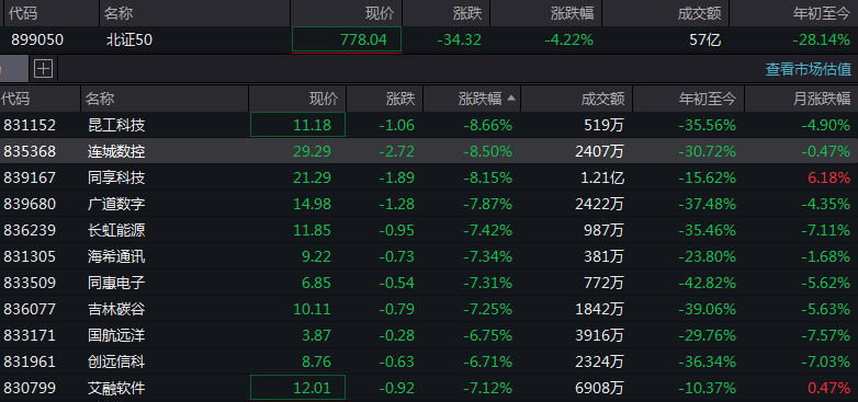 2月2日,北证50指数走弱,截至发稿,跌超4%,年初至今跌幅达28%。个股方面,昆工科技、连城数控、同享科技等跌超8%。