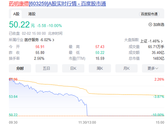 药明康德今日早盘小幅下探,午后闪崩跌停。截至收盘,该股报50.22元,全日成交35.4亿元,跌停板上封单达23万手。该股自1月26日持续走低,其中有3个交易日跌停,截至目前已累计跌超30%。