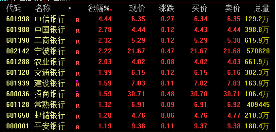 今日,银行板块表现强势,截至收盘,中信银行涨超4%,中国银行涨近3%,工商银行、农业银行涨逾2%。