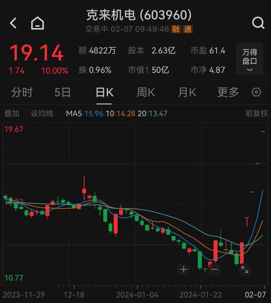 2月7日早盘,主营工业自动化应用的克来机电上演5连板。