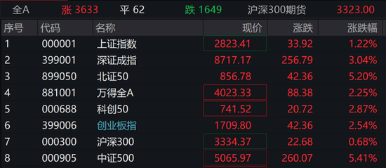 春节前倒数第二个交易日,A股持续走强,截至发稿,沪深京三市上涨个股超3600只。上证指数涨超1%,深证成指涨超3%,创业板指涨超2%,北证50涨超5%。