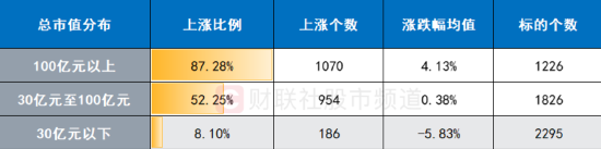 财联社2月7日电,今日,市场整体继续回暖,但微盘股则再度陷入“杀跌行情”,截至收盘,万得微盘股指数跌超9%,同代表小微风格的中证2000今日也大跌近3%。从具体个股来看,目前总市值超100亿元的1200余股中,近87.3%的个股今日实现收涨,而30亿元以下的近2300股中仅有186股飘红,上涨比例仅有8.1%,近九成微盘股下跌。目前,小微风格持续跑输市场,不少微盘股遭巨幅回撤,剔除ST和北交所,总市值居后的400股年内平均下跌近49%。(财联社 梓隆)