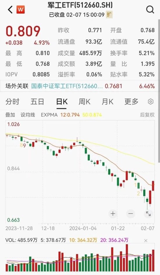 军工ETF(512660)2月7日上涨4.93%,在全市场排名靠前。