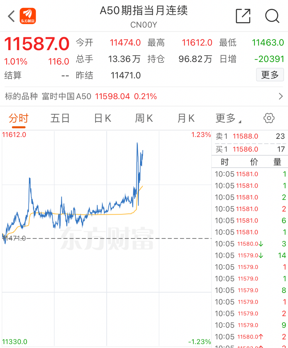 早盘,富时中国A50指数期货直线拉升,一度突破11600.00关口,日内最高涨超1.2%。