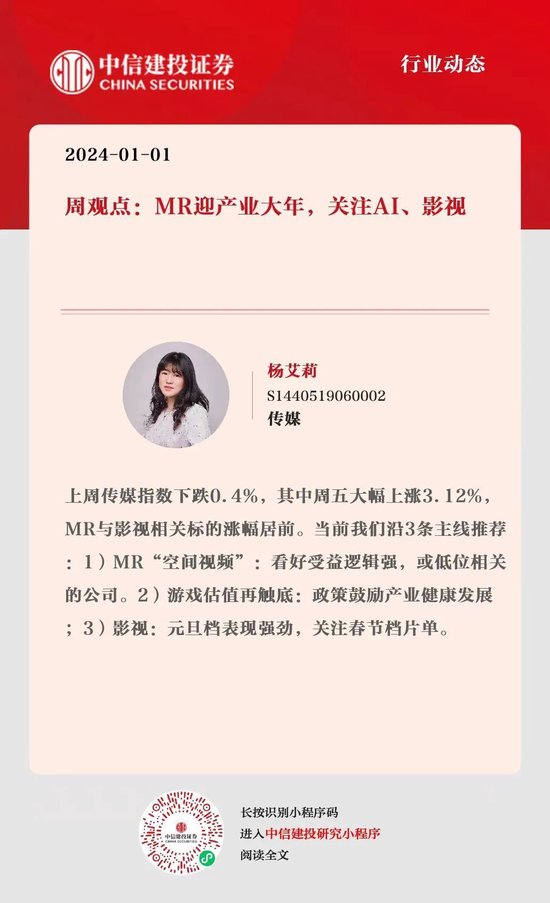 证券研究报告名称:《周观点:MR迎产业大年,关注AI、影视》