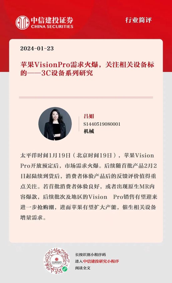 证券研究报告名称:《苹果Vision Pro需求火爆,关注相关设备标的——3C设备系列研究》