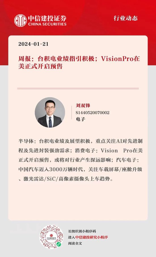 证券研究报告名称:《台积电业绩指引积极;Vision Pro在美正式开启预售》