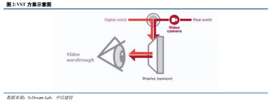 VST技术为空间计算打下基础,实现MR设备虚实融合,提升用户使用体验。透视技术为MR的核心技术之一,VST与OST是两种主流的透视技术解决方案,VST(Video See Through)通过相机捕获实时视图,通过算法加工与虚拟图像相融合,呈现在不透明显示器上,常用于智能头显设备;OST(Optic See Through)通过用户眼前半透明光学合成器传递真实世界画面,与虚拟图像进行融合,真实世界画面分辨率更接近自然状态,更多应用于智能眼镜等轻型设备。